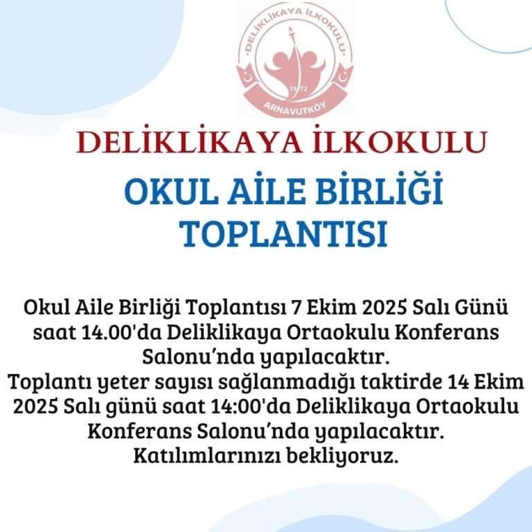 07 Ekim 2025 Salı günü saat 14:00' da Deliklikaya İlkokulu Okul Aile Birliğinin Olağan Genel Kurul toplantısı, Deliklikaya Ortaokulu konferans salonunda yapılacaktır. Salt çoğunluk sağlanamadığı taktirde 14 Ekim 2025 Salı günü saat 14.00' da yapılacaktır.